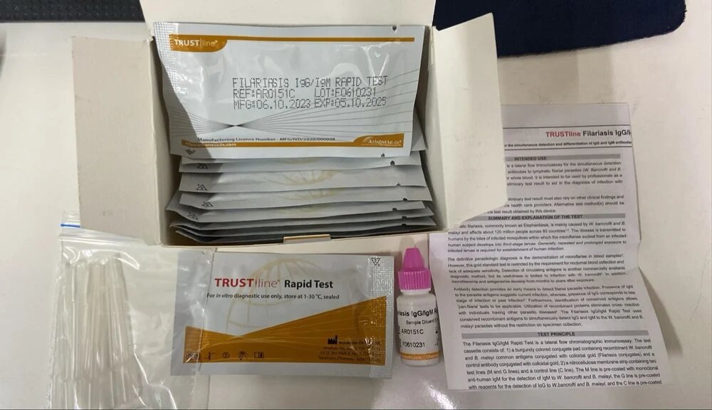 A 3 Line, Lateral Flow immunoassay for the simultaneous detection & differentiation of IgG & IgM antibodies to lymphatic filarial parasites in human serum, plasma or whole blood.