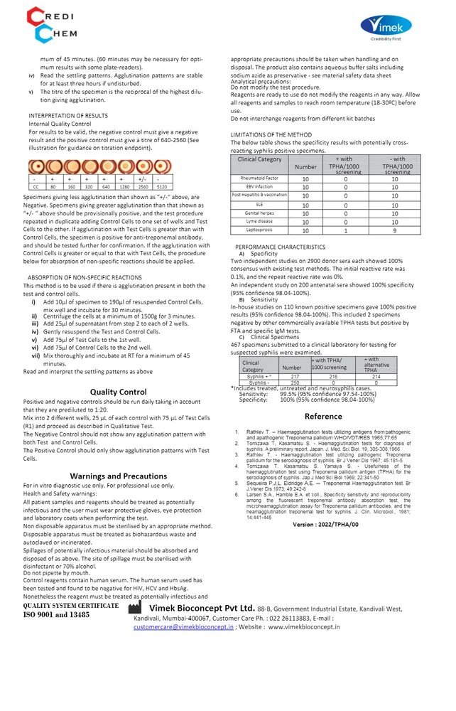 TPHA Test Kit is In-vitro Diagnostic reagent kit for specific hemagglutination test for the qualitative and semi-quantitative detection of anti-T.pallidum antibodies in human serum.