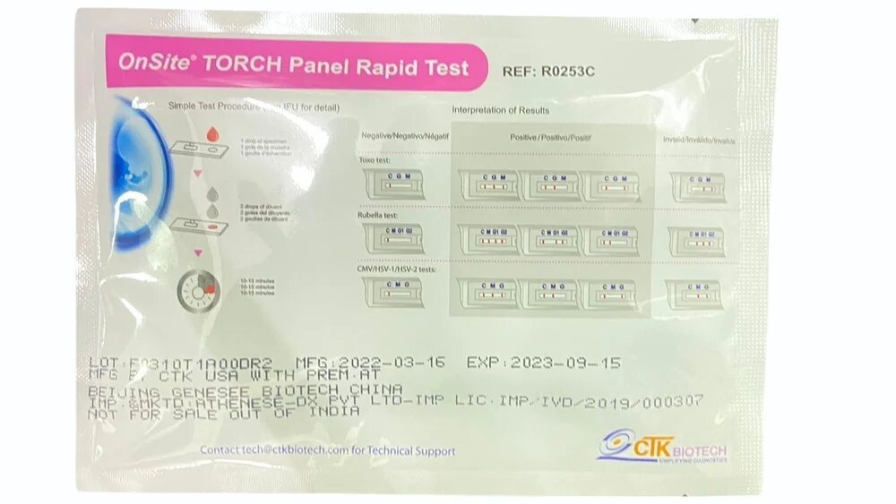 The OnSite TORCH Panel Rapid Test is a lateral flow chromatographic immunoassay for the qualitative detection and differentiation of antibodies (IgG and IgM) to Toxoplasma gondii (T. gondii), rubella virus, cytomegalovirus (CMV), herpes simplex virus 1 (HSV-1), and herpes simplex virus 2 (HSV-2) in human serum, plasma, or whole blood.
